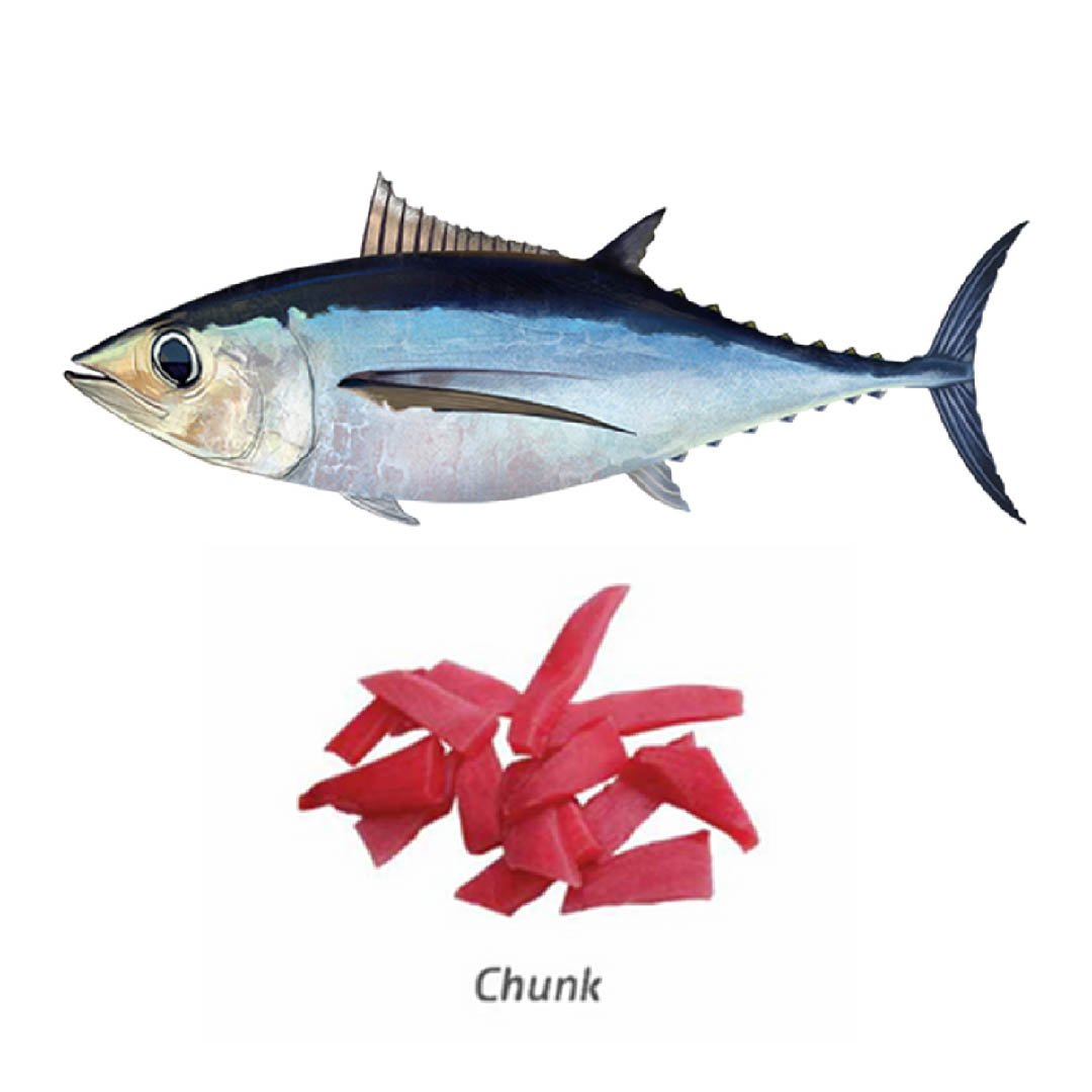 Tuna cut into chunks, commonly used for canned products or ready meals.